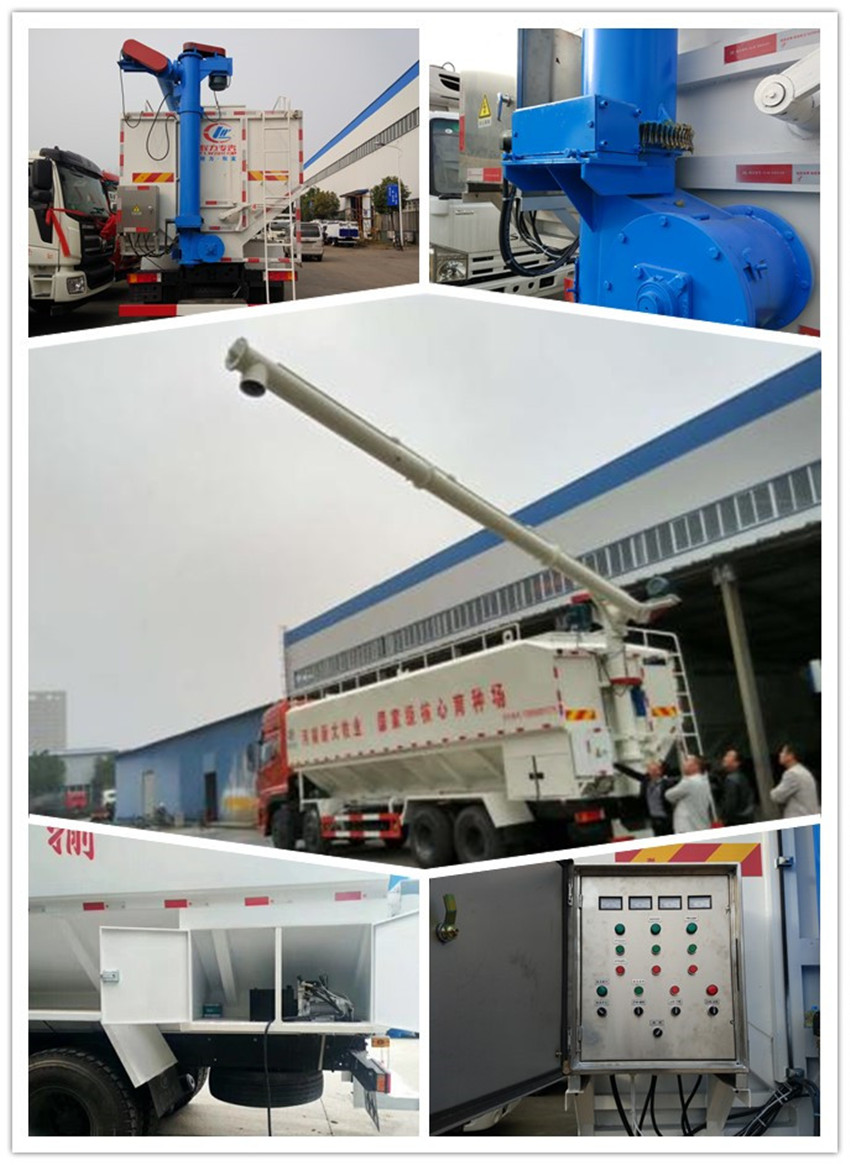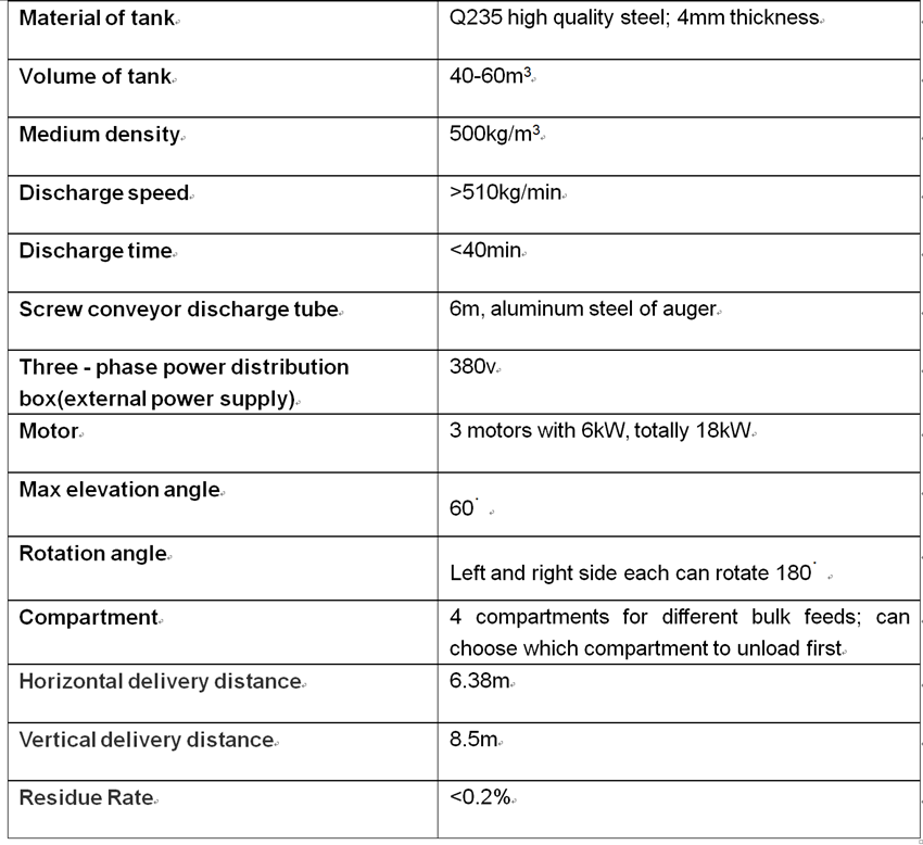 The discharging auger is 7.8m long (discharging at the top, with a diameter of 219mm). The auger at the top is hydraulically controlled for lifting, with a lifting angle of 60 degrees. It can rotate 180 degrees on one side and lift up and down. It is equipped with Delixi or Schneider electric control boxes. The unloading speed is 1 ton/min. One person can complete the operation independently.