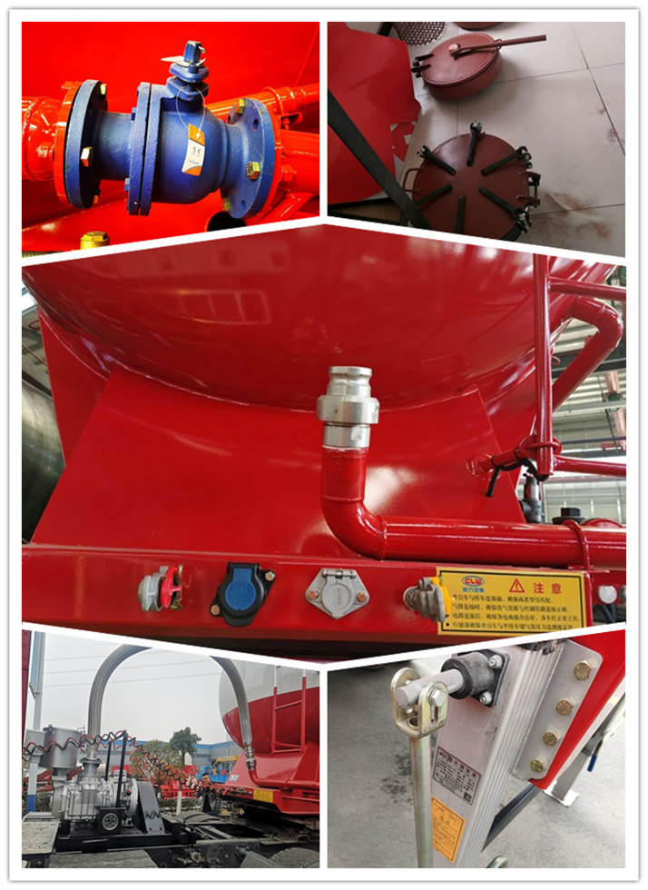 The semi trailer powder material transport vehicle uses its own engine power to drive the vehicle mounted air compressor through the power take-off, and sends the compressed air into the air chamber at the lower part of the sealed tank through the pipeline, so that the cement on the fluidized bed is suspended into a fluid state. When the pressure in the tank reaches the rated value, open the unloading butterfly valve, and the fluidized cement is transported through the pipeline. It is made by domestic advanced technology, with novel design and durability. Air bag type has large bearing capacity, fast unloading speed and small residue.