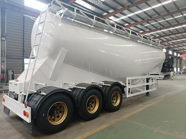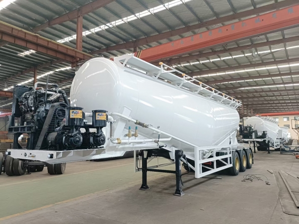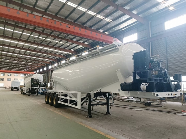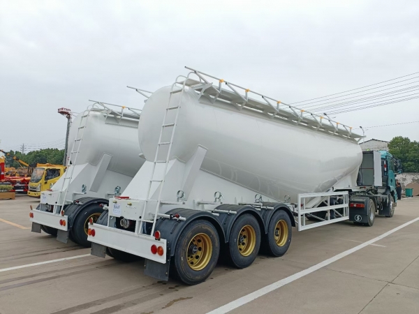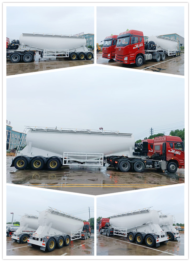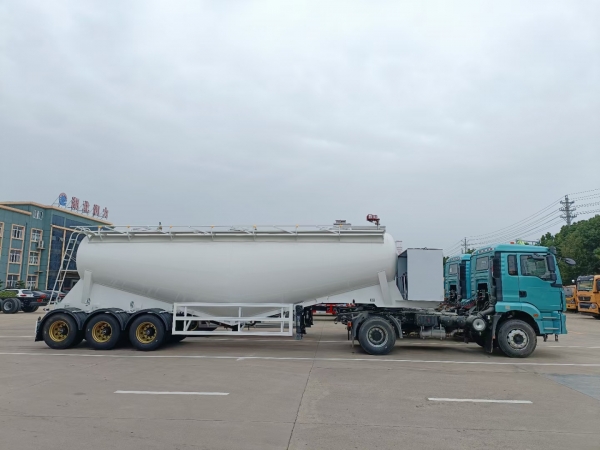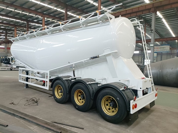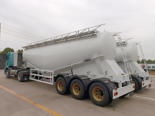 Powder material semi-trailer is a special vehicle for the transportation of large quantities of dust materials (bulk cement). It is generally applicable to areas where weight charging is strictly carried out according to regulations, and its volume is generally between 35-45 cubic meters. It is applicable to the transportation and pneumatic unloading of fly ash, cement, lime powder, ore powder and other dry materials with particle diameters not greater than 0.1mm. When the vertical height of unloading reaches 15m, the horizontal conveying distance can also reach 5m.