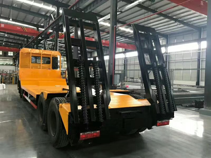 Dongfeng Tianlong avant quatre arrière huit voiture plate adopte une échelle d‘escalade de conception renforcée, adopte trois barres et un traitement de renforcement à double ressort, avec pieds arrière, plaque plate avec support diagonal, la plaque plate peut être étendue et contractée, étendre 3 mètres, rétracter 2,55 mètres, la longueur de la boîte de chargement 8,2 mètres, idéal pour le transport de 30 à 40 tonnes de grandes pelles, de gros engins de construction et d‘autres camions à plateau.