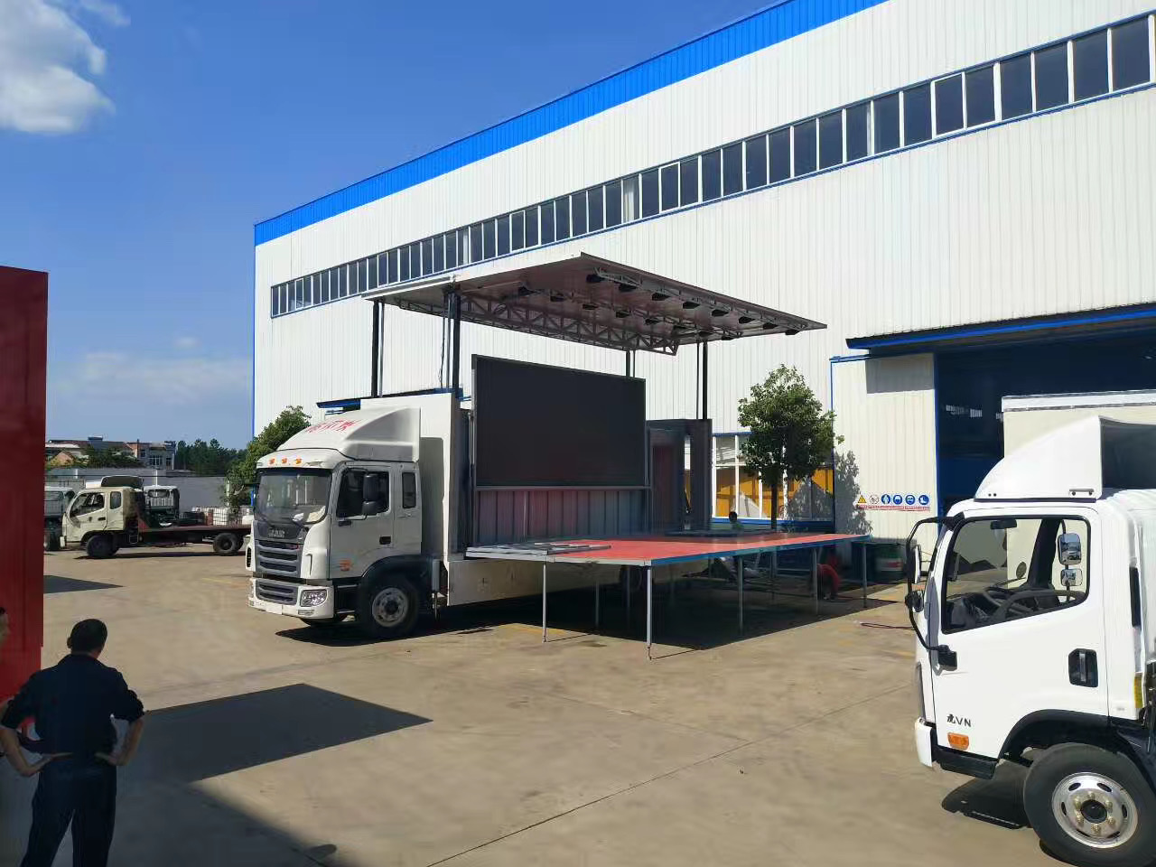 Déplié des deux côtés: les deux ailes et le toit se lèvent en même temps, étage hydraulique rabattable à gauche et à droite, 16 vérins hydrauliques. L‘espace principal de la scène est de 58 mètres carrés, avec 3 mètres carrés de plate-forme audio auxiliaire, 2 écrans publicitaires et 1 échelle de scène à l‘arrière de l‘avant et de l‘arrière de la voiture. L‘ouverture de la scène est de 10,6 mètres de large et la superficie totale est de 64 mètres carrés. (Peut être équipé d‘une décoration intérieure telle qu‘un écran LED selon la demande)