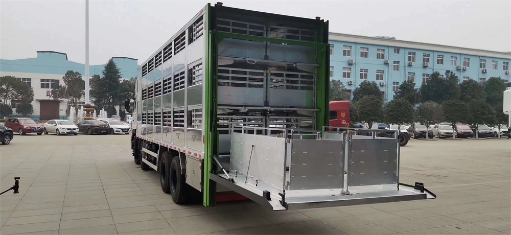 Le camion de transport de porcs peut être constitué d‘une structure de corps à trois ou quatre couches 100% en alliage d‘aluminium, tête d‘arrosage en acier inoxydable et tête d‘abreuvement