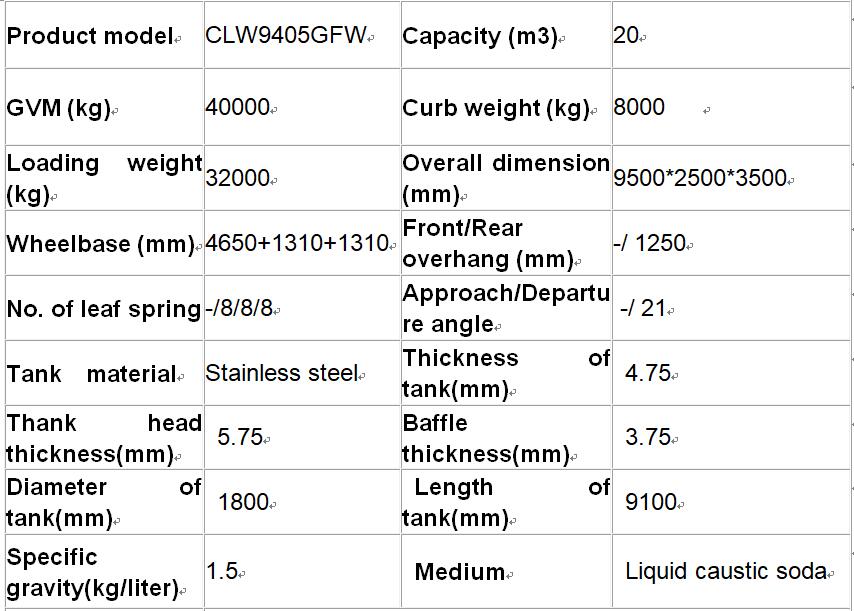 20 CBM LIQUID CAUSTIC SODA CHEMICAL TANKER TRAILER, Stainless steel material, FUWA or BPW axles. JOST towing pin and support legs.Two SS manholes;Two SS breathing valves;SS discharge ball valves;SS bottom valve.Steel mudguard;Tool box;Fire extinguishers;One spare tire;Ladder;Lift handrail,etc.