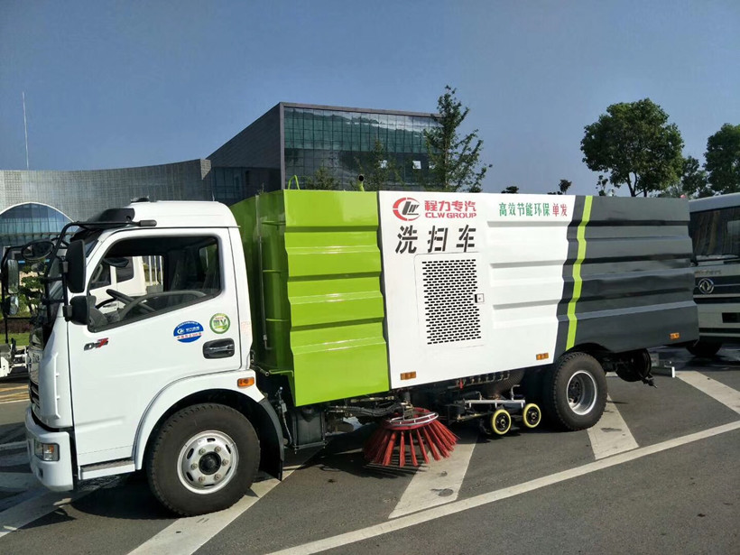 1. Dongfeng washing and sweeping vehicle adopts washing, sweeping, sucking and mixing to collect garbage, wet dust removal, electro-hydraulic PLC one-button control, hydraulic dumping and unloading operation mode to clean the road surface.
