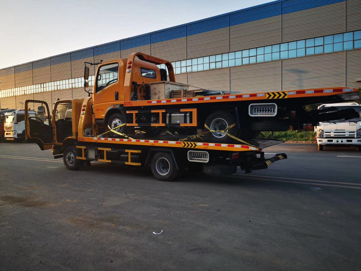 3P2A folding stamping flatbed, one drag two type, double side linkage operation loading, 3 rear working lights, 1 40KN hydraulic winch (25 meters steel wire rope), 1 tool box, 1 hand washing box, equipped with 2 trolleys, A pair of L-shaped tire holding frames, a plate length of 4.3 meters, a plate width of 2.3 meters (rear tail plate can be added), a maximum load mass of 3 tons, a binding belt, with long warning lights, two trolleys, a pair of forks One chain hook, one pair of fork holders, the rest are standard in the factory. Paint: customized, with reflective strips.