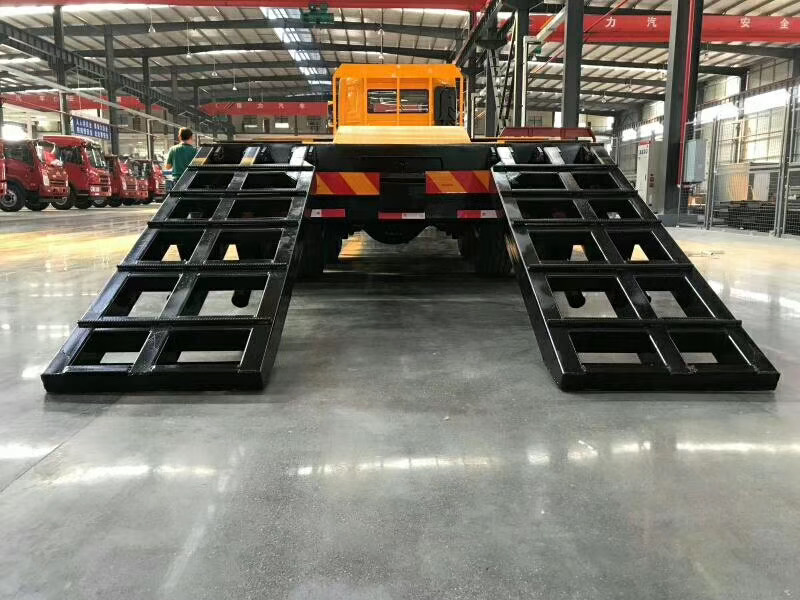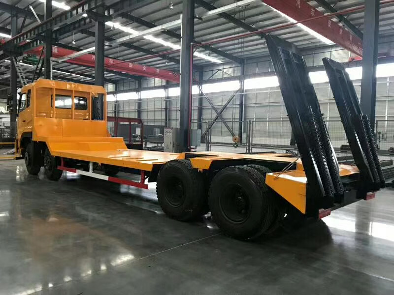 Dongfeng Tianlong front four rear eight flat car adopts reinforced design climbing ladder, adopts three bars and double spring reinforcement treatment, with rear legs, flat plate with diagonal support, flat plate can be extended and contracted, extend 3 meters, retract 2.55 meters, the length of the cargo box flat plate 8.2 meters, ideal for transporting 30-40 tons of large excavators, large construction machinery and other flatbed trucks.