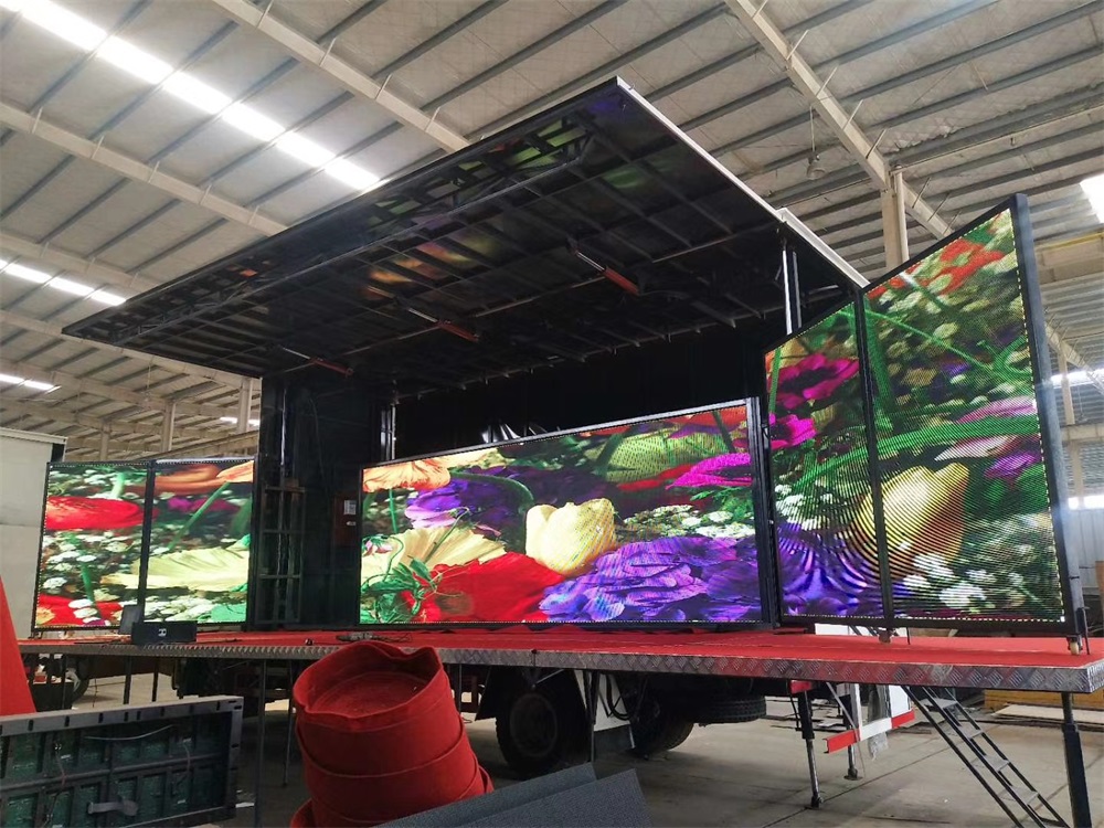 1. P5 indoor high-definition LED display is used inside the cabin, and the size can be selected according to user needs; the screen can be lifted up by 1 to 1.5 meters (height from the bottom of the box) along the slide rail through the hydraulic lifting system Lock the valve to control the lifting of the screen.