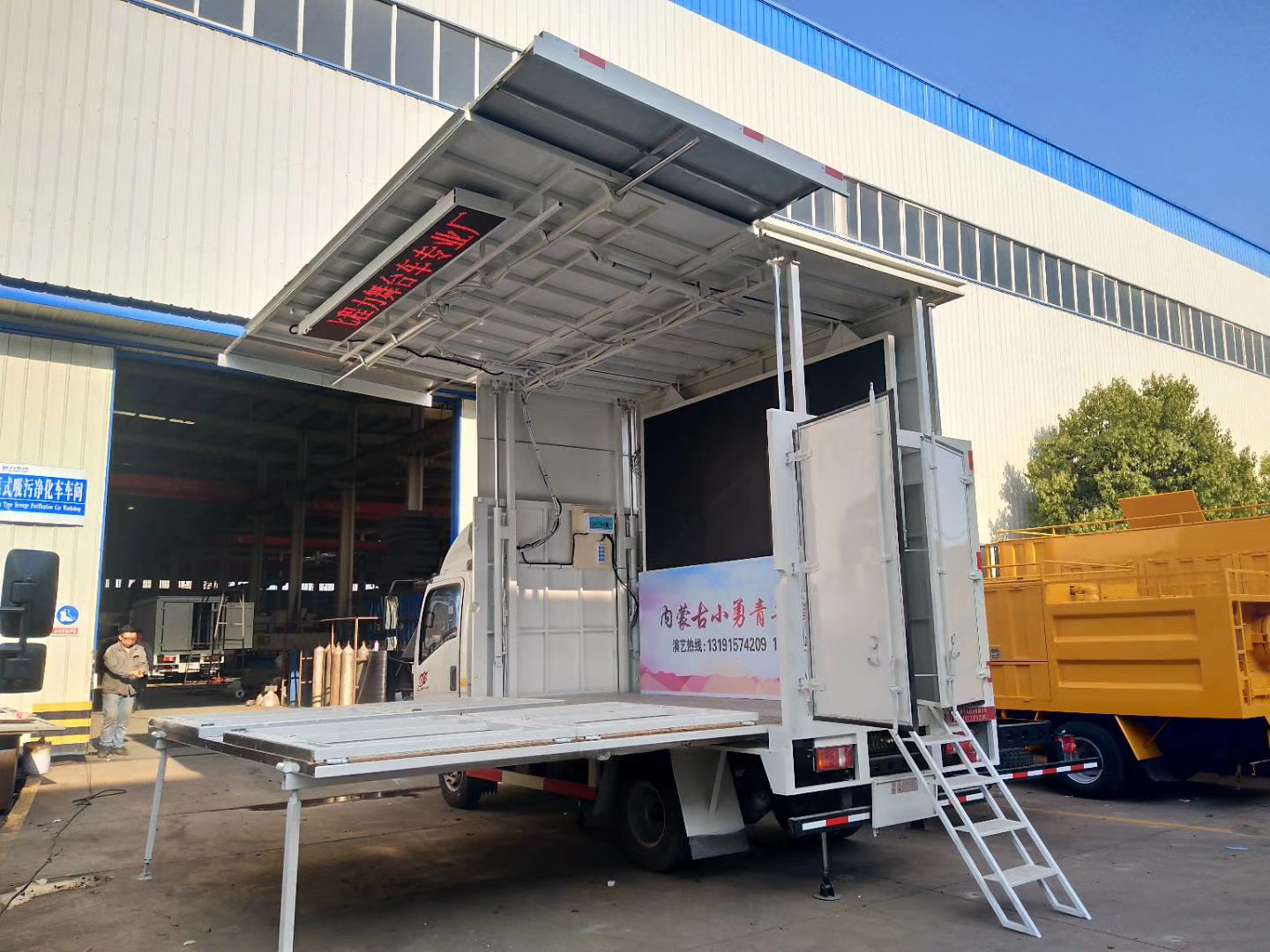 ② Unfolded on the left side, lifted and lowered with the top [top lift 1.3-1.5 meters], built-in folding hydraulic stage, 12 hydraulic pressure, two temporary stage boards and advertising screens at the front and rear, 7 meters at the entrance 2. The total area is 2 square meters.
