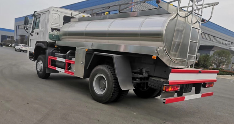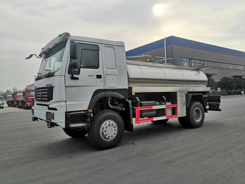 Sinotruk HOWO 4x2 290Hp, 8000L fresh milk transport truck with 380V food grade SS motor pump and level alarm. This truck is customized for export.