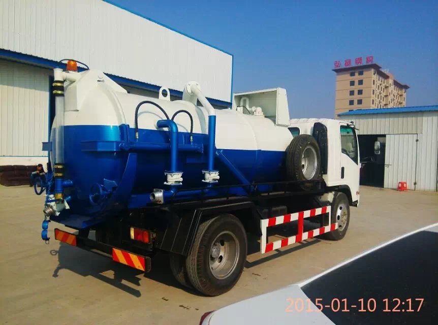 The tank body of the ISUZU 8CBM sewage suction truck adopts the national standard 6mm thick WISCO carbon steel plate, SK-15 water circulation vacuum suction pump, the tank head is die-casted once, and the automatic welding technology is used. Tailband diameter 100mm ball valve. The ball valve can be equipped with pneumatic control in the cab. The center is equipped with double-top hydraulic self-unloading. The dirt in the tank can be dumped directly after opening the back cover. With a 8-meter 4-inch steel wire rubber suction pipe. The rest are standard: power take-off, transmission shaft, four-way ball valve, multi-way directional valve, blowdown valve, pollution window, vacuum pressure gauge, pipe network system, hydraulic system, hand washing device, pressure relief valve, anti-overflow valve Etc composition.