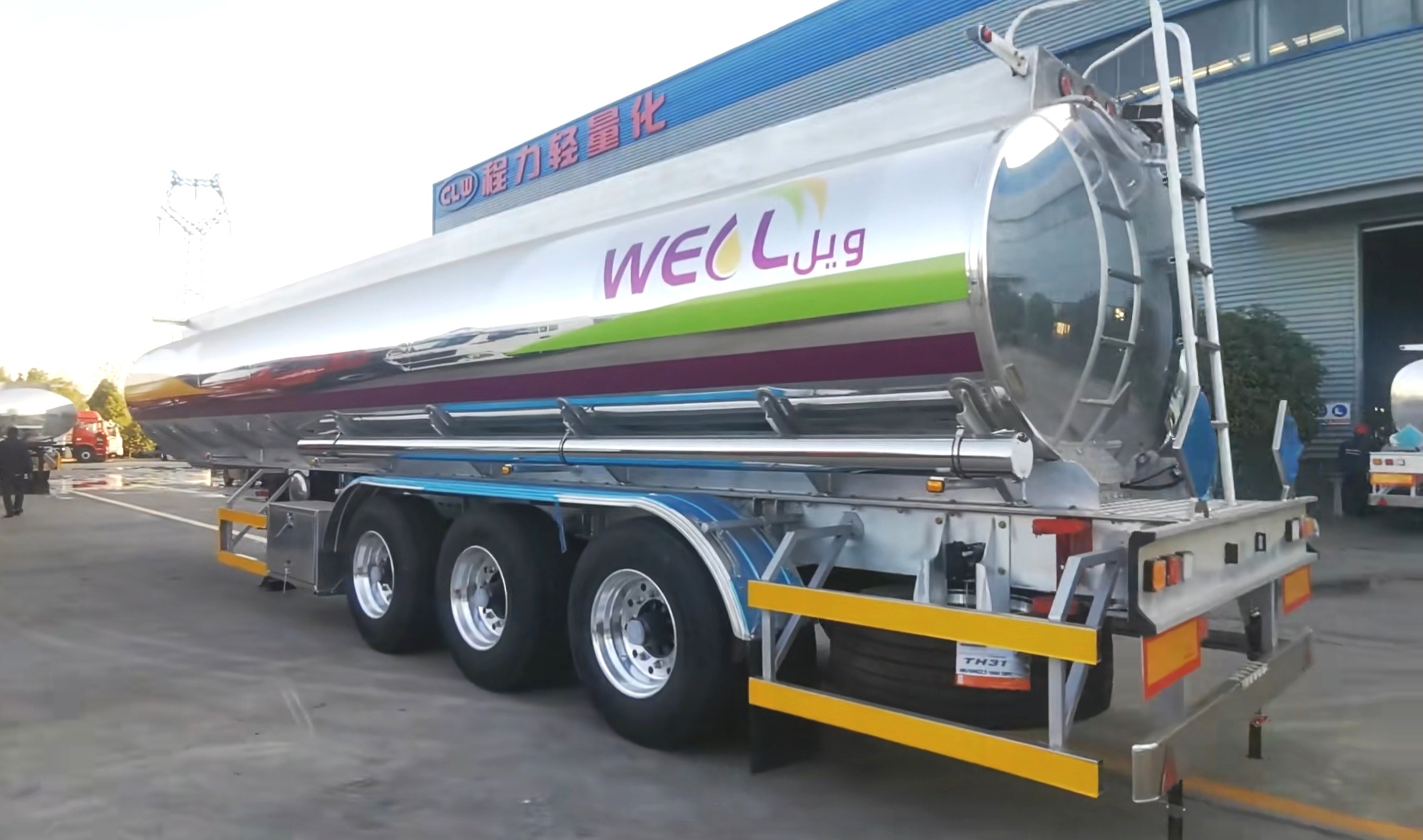 42 cubic mirror aluminum alloy tanker semi trailer: 5454 aluminum alloy plate, 5.5 thick tank body, 6 thick head, 6 thick diaphragm, single compartment, with two CIVACON submarine valves, two CIVACON European standard tank mouths, 3 Fuhua or BPW bridges, 385/65R22.5 tires with aluminum alloy steel rings, Fuhua or BPW air suspension, JOST legs, JOST50 # bolt traction pin.